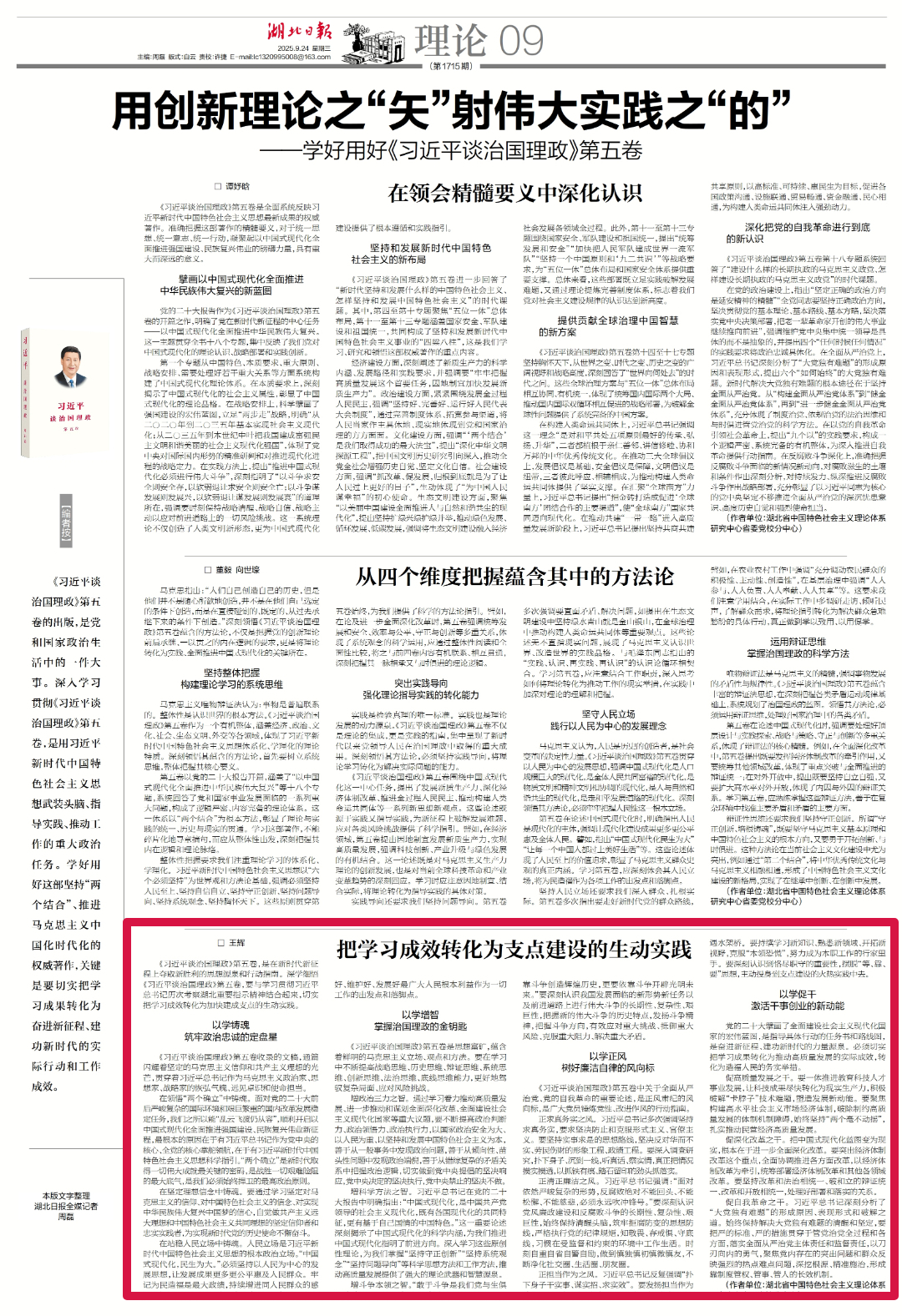 《习近平谈治国理政》第五卷,是在新时代新征程上夺取新胜利的思想源泉和行动指南。深学细悟《习近平谈治国理政》第五卷,要与学习贯彻习近平总书记历次考察湖北重要指示精神结合起来,切实把学习成效转化为加快建成支点的生动实践。