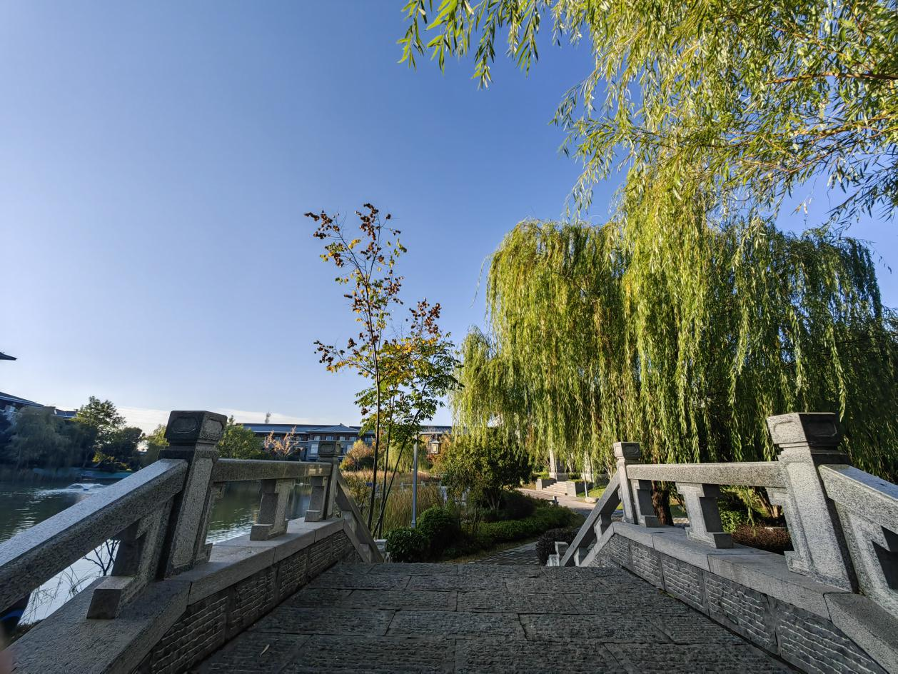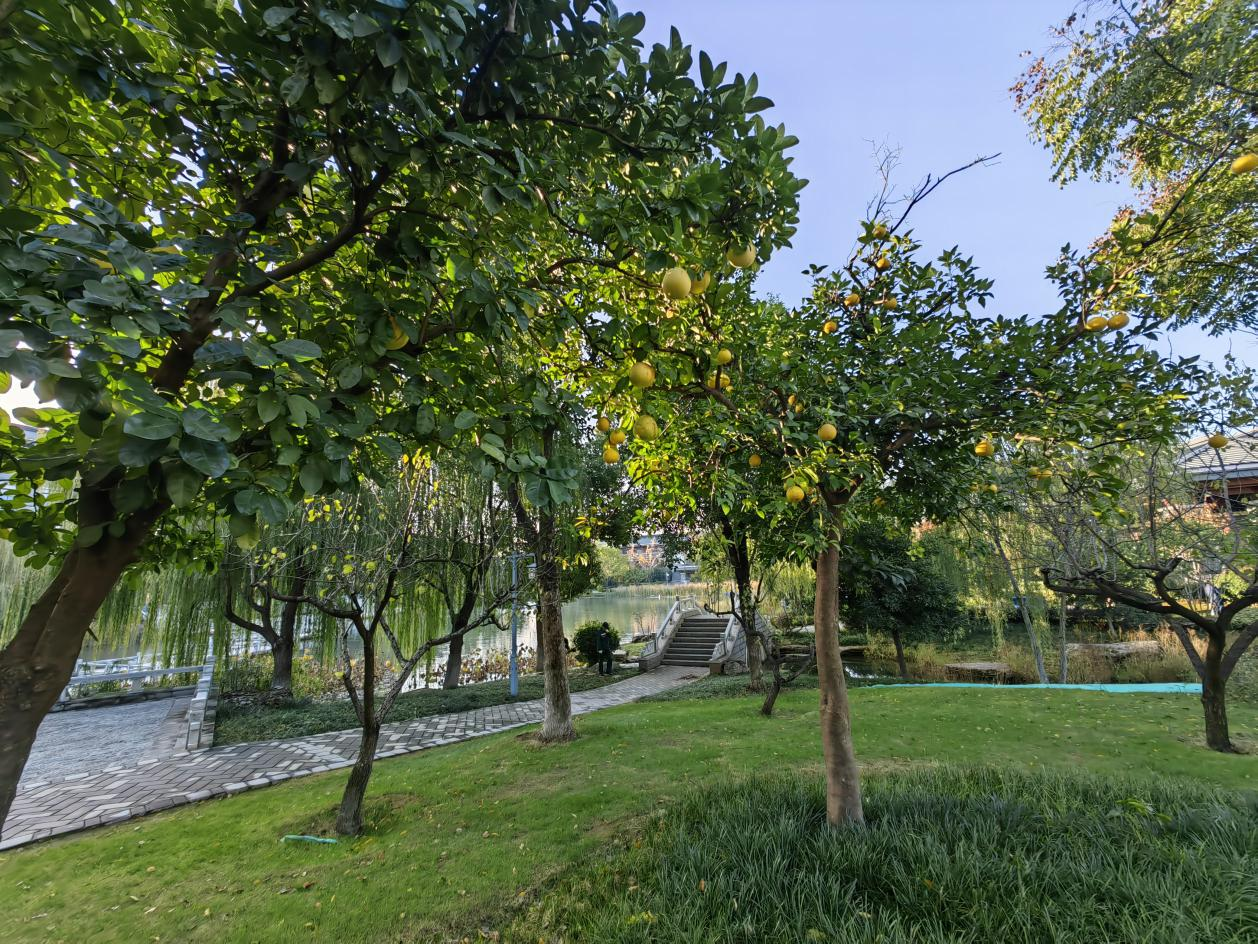 党校里面有一小片湖水,碧波荡漾,锦鲤嬉戏,白鹅游弋。湖的周围除了柳树,还有几棵山楂树、柚子树和香橼树,果实挂满枝头,红的、黄的与绿树蓝天相映成趣,甚是好看……