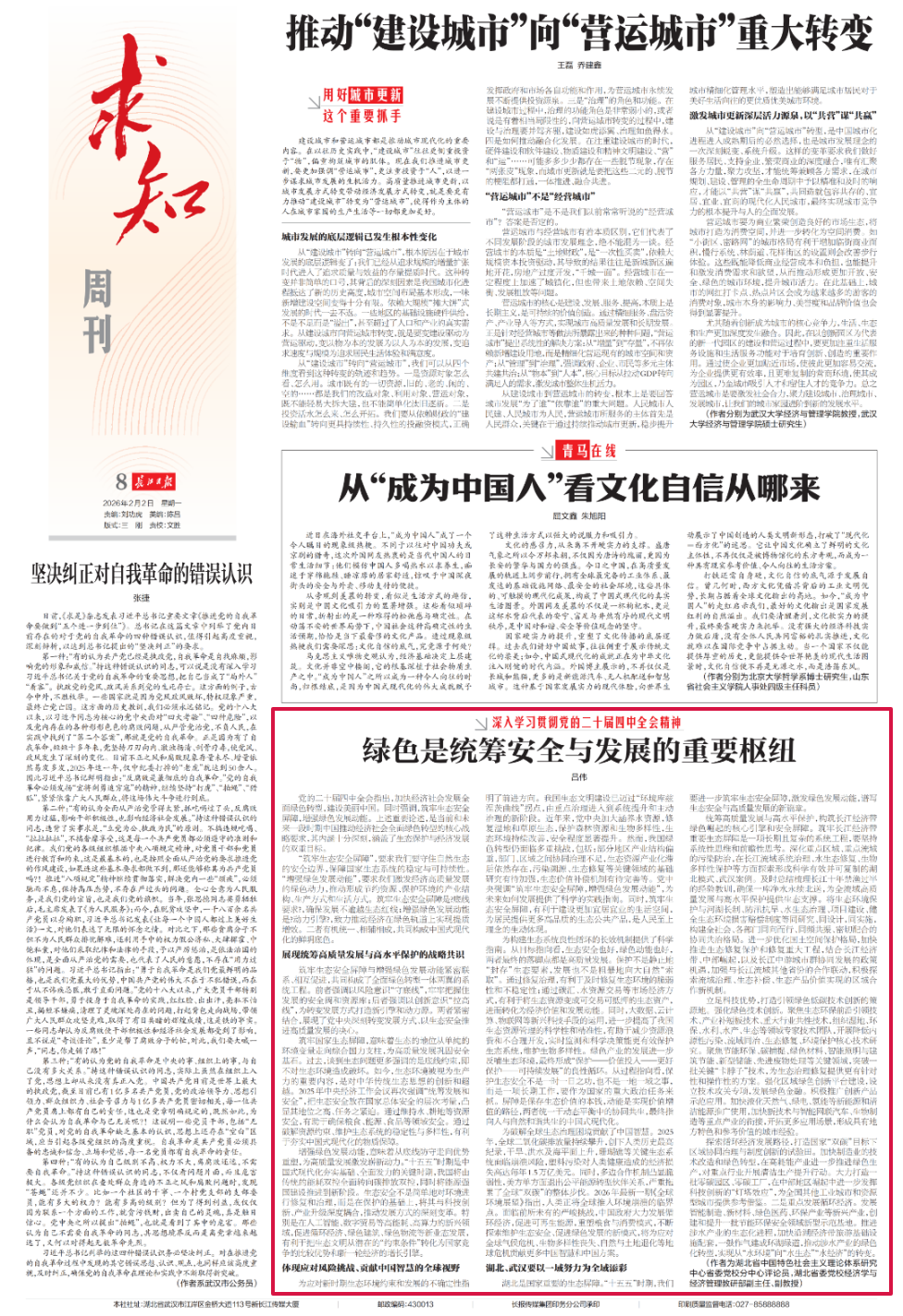 2月2日,《长江日报》08版求知周刊板块刊发中共湖北省委党校(湖北省行政学院)经济学与经济管理教研部副主任、副教授吕伟文章——《绿色是统筹安全与发展的重要枢纽》。现予以转载。
