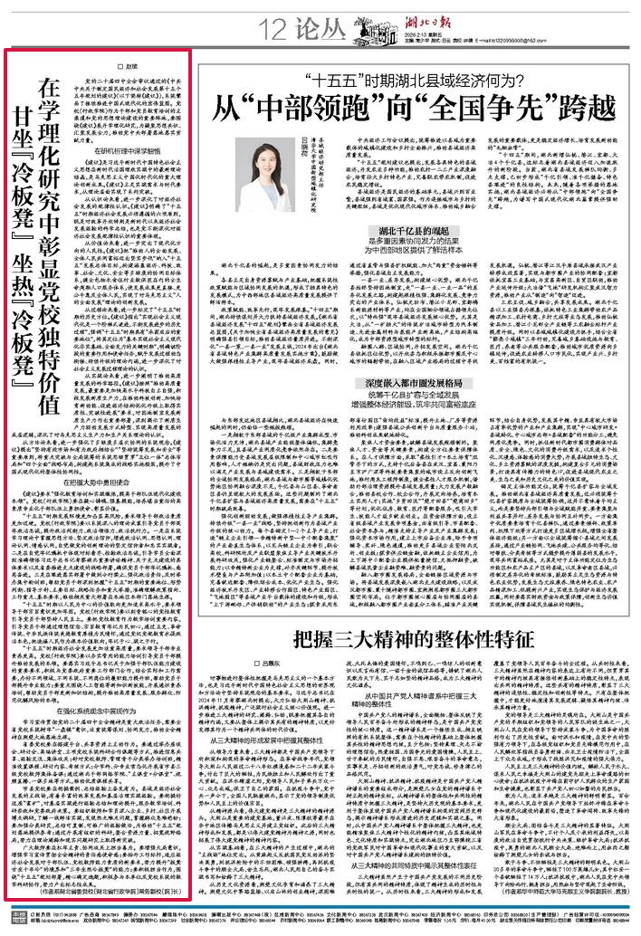 2月13日,《湖北日报》12版论丛版块刊发中共湖北省委党校(湖北省行政学院)常务副校(院)长赵斌文章《甘坐“冷板凳” 坐热“冷板凳” 在学理化研究中彰显党校独特价值》。现予以转载。