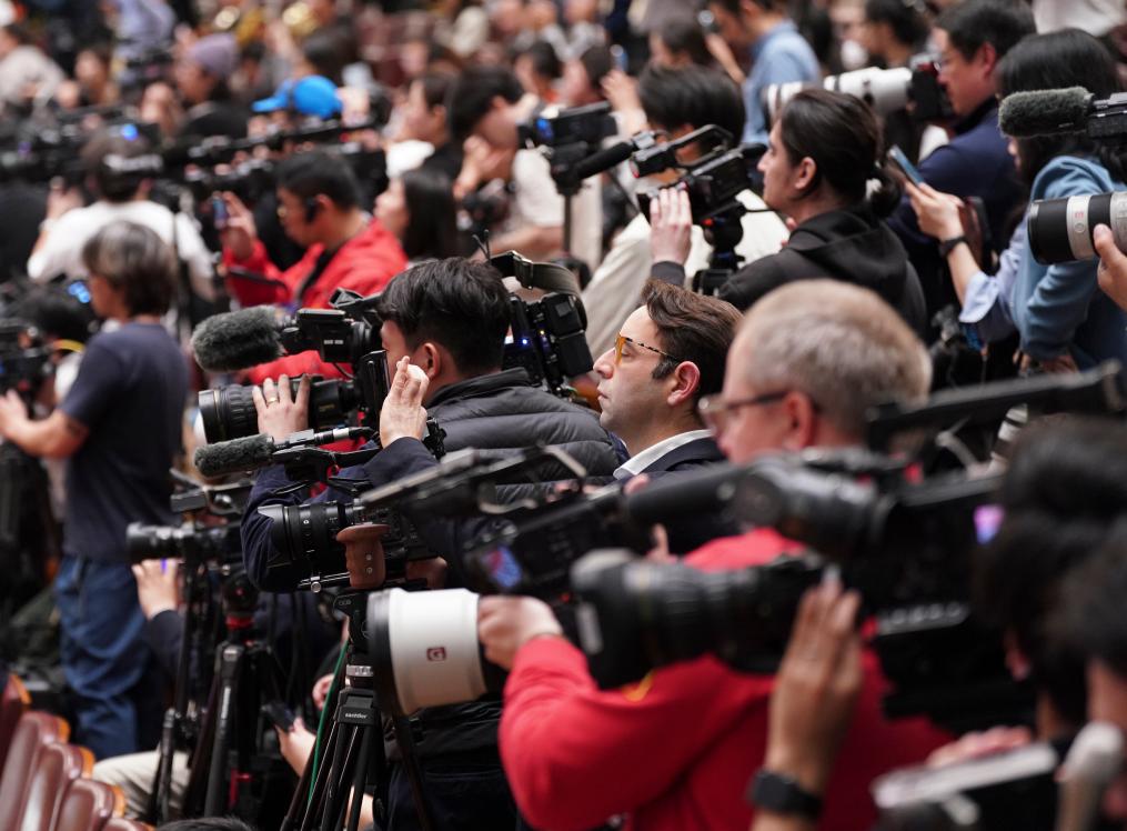 3月12日,第十四届全国人民代表大会第四次会议在北京人民大会堂举行闭幕会。这是记者在闭幕会上采访。新华社记者 傅天 摄