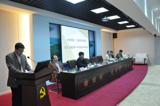 2013年11月8日上午,湖北省行政学院在荆门市召开了全省行政学院系统信息化设暨干部远程培训推进会。国家行政学院信息技术部夏红副主任到会并致辞。湖北省行政学院常务副院长陶良虎、荆门市委副书记周松青分别讲话。国家行政学院音像出版社社长张仲宇应邀出席会议并在主席台就座。各市州行政学院分管信息化建设的副院长和信息化建设部门负责同志40多人参加会议。