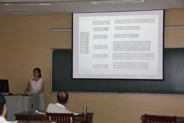 围绕“《论共产党员的修养》解读”这一新专题,郭群英、李珊珊、李诗夏三位年轻教师分别进行了试讲。按照试讲要求,三位教师分别介绍了新专题的基本框架、重点和难点问题,并从“《论共产党员的修养》解读”的历史背景、主要内容、现实意义三个方面选取部分内容进行了详细讲解。试讲结束后,三位教师进行了自评和互评,其他与会同志对三位教师的教学框架、讲授重点、授课内容和语言表达进行了全方位点评,提出许多中肯的意见和建议。