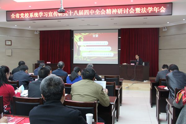 本次会议为期1天,分开幕式、专家报告、大会交流、颁奖典礼、会议总结等5个环节。开幕式后,武汉大学法学院副院长汪习根教授为与会代表作十八届四中全会精神专题辅导报告。汪习根教授结合湖北实际,深入解读了全面推进依法治国的重要意义、总体部署、重大举措。十堰市委党校李刚、武汉市委党校周昕、省委党校孙才华、恩施州委党校穆华桂、省委党校王辉、黄冈市委党校彭丽、恩施州委党校张永群、武汉市委党校涂克明、宜昌市委党校蔡小娥围绕主题进行了交流发言。