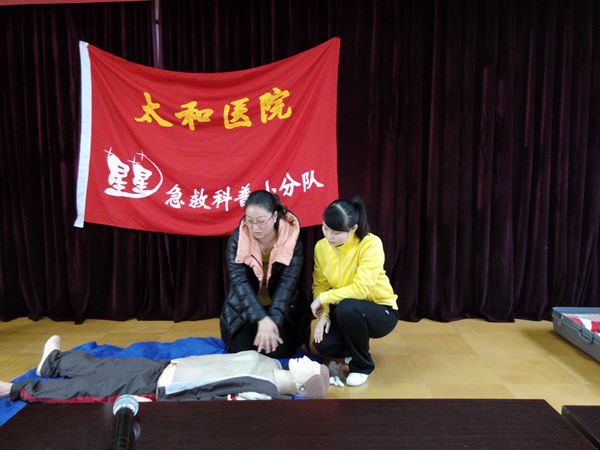 “01、02、03、04、05……28、29、30”讲台上传来急促而有规律的数数声,这不是在做游戏,而是太和医院急救小分队的队员在模拟为呼吸心跳骤停的患者做心肺复苏演练。急救小分队耐心地为学员们讲解急救的操作要领及方法、步骤。演练现场,学员们热情高涨,踊跃上台依次演练急救的具体操作程序,就如何判断环境是否安全、如何判断患者的生命体征、如何进行胸外按压和人工呼吸进行一一演练。随后,学员们就日常生活中可能遇到的外伤、被毒蛇咬伤、被异物卡住气管等的急救小问题争相提问,急救小分队也一一作了解答。