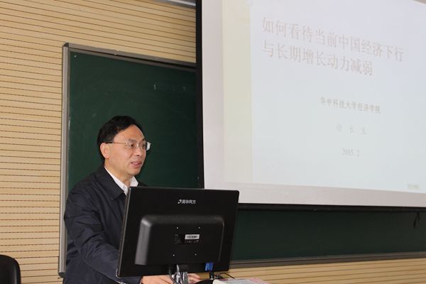 4月20日,我校硕士研究生政治经济学专业校外导师、华中科技大学经济学院博士生导师徐长生教授为全体硕士研究生做了“中国经济下行压力与长期增长动力”专题报告。报告会由副校长邹德文教授主持,经济学教研部副主任王能应教授及政治经济学专业导师组成员、研究生部工作人员及全体硕士研究生参加报告会。