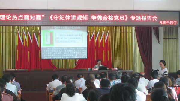5月19日,湖北省委党校专家组一行赴孝感市孝南区书院社区开展2015年度理论热点面对面示范点建设活动。省委党校专家组组长综合教研部主任李银安、党史党建教研部副教授郭群英、科研处副处长王汉军,孝感市委宣传部副部长张国雄、讲师团副主任胡雪城,市委党校常务副校长傅晓波,孝南区委常委、宣传部长姚惠萍等领导参加了此次活动。上午,李银安教授和郭群英副教授分别给书院街道80余名干部群众做了生动的理论宣讲。宣讲活动结束后,省委党校专家又分别在书院街道和市委党校召开了两个示范点建设工作座谈会,分别与孝感市、区、街、社区和市委党校的有关领导、专家进行了交流,共同探讨了如何进一步做好理论面对面示范点建设工作。此次活动内容紧凑,效果好、收获大。