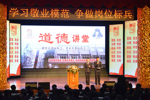 “学习敬业模范,争做岗位标兵”,此次活动按照“自我反省、唱歌曲、学模范、颂经典、发善心、送吉祥、向“德”鞠躬、做善事”八个环节有序进行,通过宣讲身边看得见、学得到的“平民英雄”和“凡人善举”,宣传爱岗敬业、无私奉献的道德品质,讲述身边好人事迹,感悟道德风尚。该校青年教师颜芳深情讲述了退休教师、共产党员陈人海的先进事迹。“坚持革命继吾志,誓将真理传人寰”,21年递交入党申请书,他对入党的追求坚定执着;“路漫漫其修远兮,吾将上下而求索”,站在三尺讲台,他对事业的追求孜孜不倦;“春蚕到死丝方尽,蜡炬成灰泪始干”,六改书名,十易其稿,二十年著一书,与生命争时间,他的晚年激情燃烧。鲜艳的红烛在大屏幕上熠熠生辉,“三个二十年”的感人事迹在大厅久久回响。听了陈人海老师的事迹,大家纷纷发表感悟,表示要学习陈人海老师对党的无限忠诚和对事业的不竭热爱,像爱护自己的饭碗一样珍惜自己的岗位,多一些付出,少一些计较;多一些宽容,少一些抱怨,在平凡的岗位中树立不平凡的形象,实现人生的自我价值。