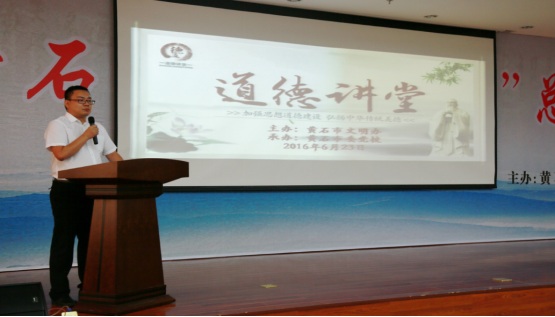 6月23日下午,由黄石市文明办主办、黄石市委党校承办的黄石市道德讲堂在黄石道德讲堂总堂成功举办。活动以“我爱我的祖国”为主题,通过“问自己、唱歌曲、讲故事、学模范、写感言谈感悟、诵经典、行遵德礼、贴国旗唱国歌”等八个环节,运用市民喜闻乐见、生动活泼的形式,进一步弘扬了爱国主义精神,激发了爱国、报国、兴国、强国的正能量。市文明办主任王书南、市文明办副主任刘振洪及我校领导班子成员出席了活动。我市部分省市级文明单位代表,我校全体教职工、大冶市委党校及阳新县委党校部分教职工等共280多人参加了活动。