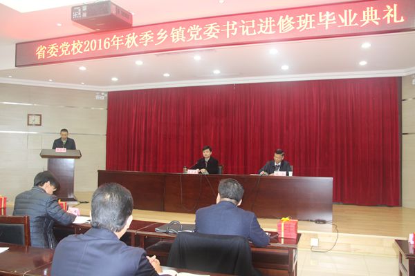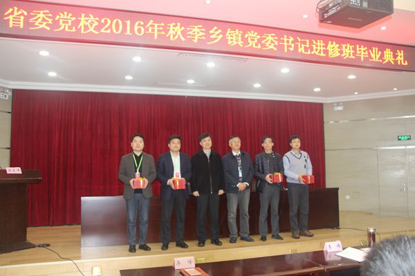 12月21日上午,省委党校2016年秋季乡镇党委书记进修班毕业典礼在教学楼报告厅举行,副校长肖卫康出席并讲话,学员组织处处长周跃主持会议并宣读关于表彰优秀班干部的决定,乡镇党委书记班党支部书记、班长徐品强和研究报告撰稿人赵斌分别作交流发言。