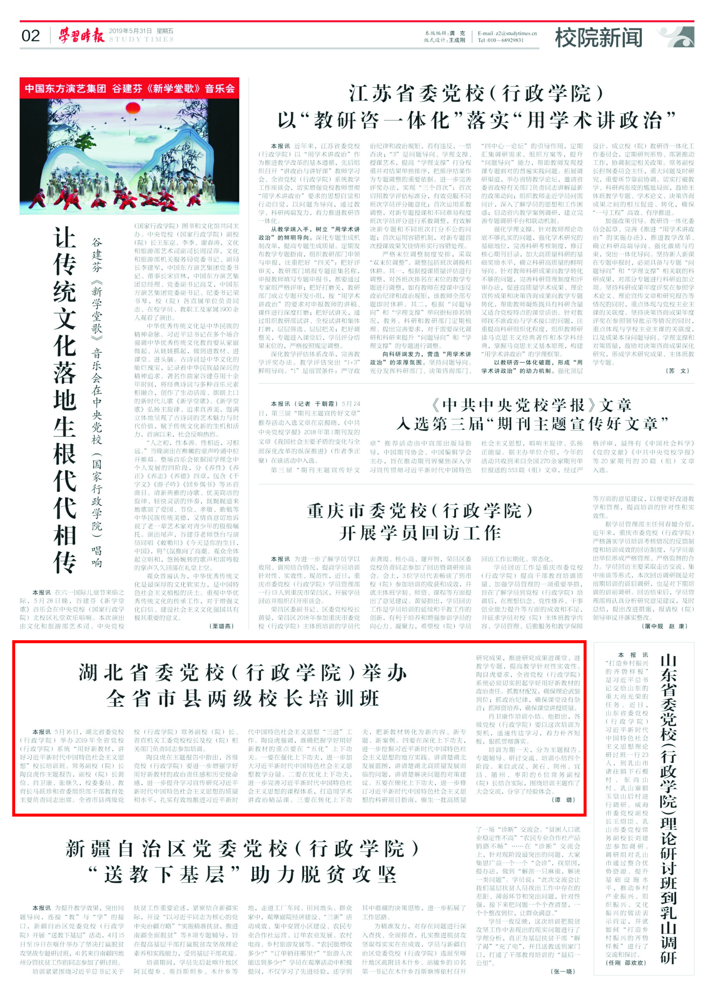 5月31日,中央党校《学习时报》刊发《湖北省委党校(行政学院)举办全省市县两级校长培训班》,对我校(院)举办全省党校(行政学院)系统“用好新教材,讲好新思想”校长培训班,坚持不懈创新举措推进习近平新时代中国特色社会主义思想进教材、进课堂、进头脑,积极打造用学术讲政治精品课给予充分肯定。