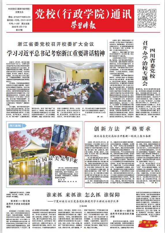 4月17日,中央党校《学习时报》刊发《创新方法 严格要求 湖北省委党校高标准开展新一轮线上集体备课》,对我校(院)统筹推进疫情防控和复学复训工作,积极探索“钉钉”视频会议线上备课新方法,高标准打磨用学术讲政治精品课和案例教学示范课,持续深化党校教学改革给予充分肯定。