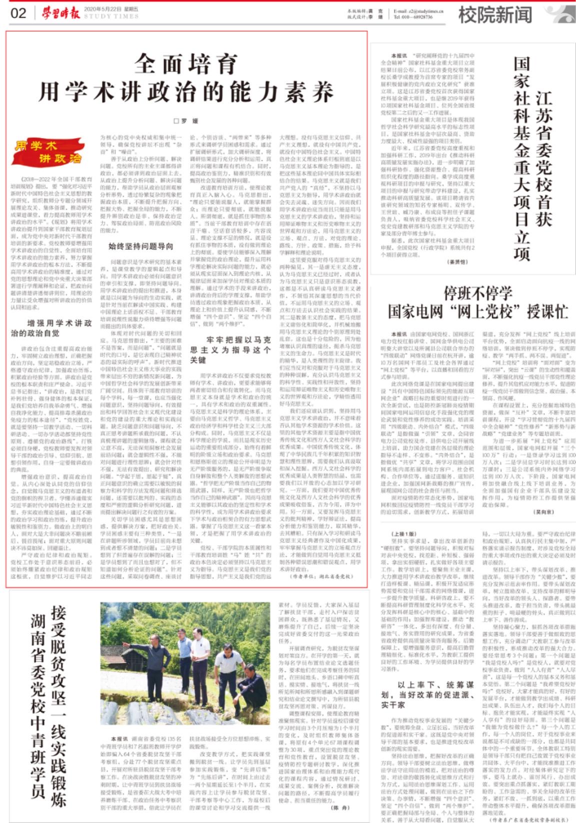 我校教务处罗媛在今天(5月22日)中央党校《学习时报》上发表题为《全面培育用学术讲政治的能力素养》的理论文章。近年来,我校始终坚持“用学术讲政治”教学理念,努力探索“用学术讲政治”方式方法,大力推进“用学术讲政治”教学改革。此文是我校深入开展“用学术讲政治”教学研究的积极探索。