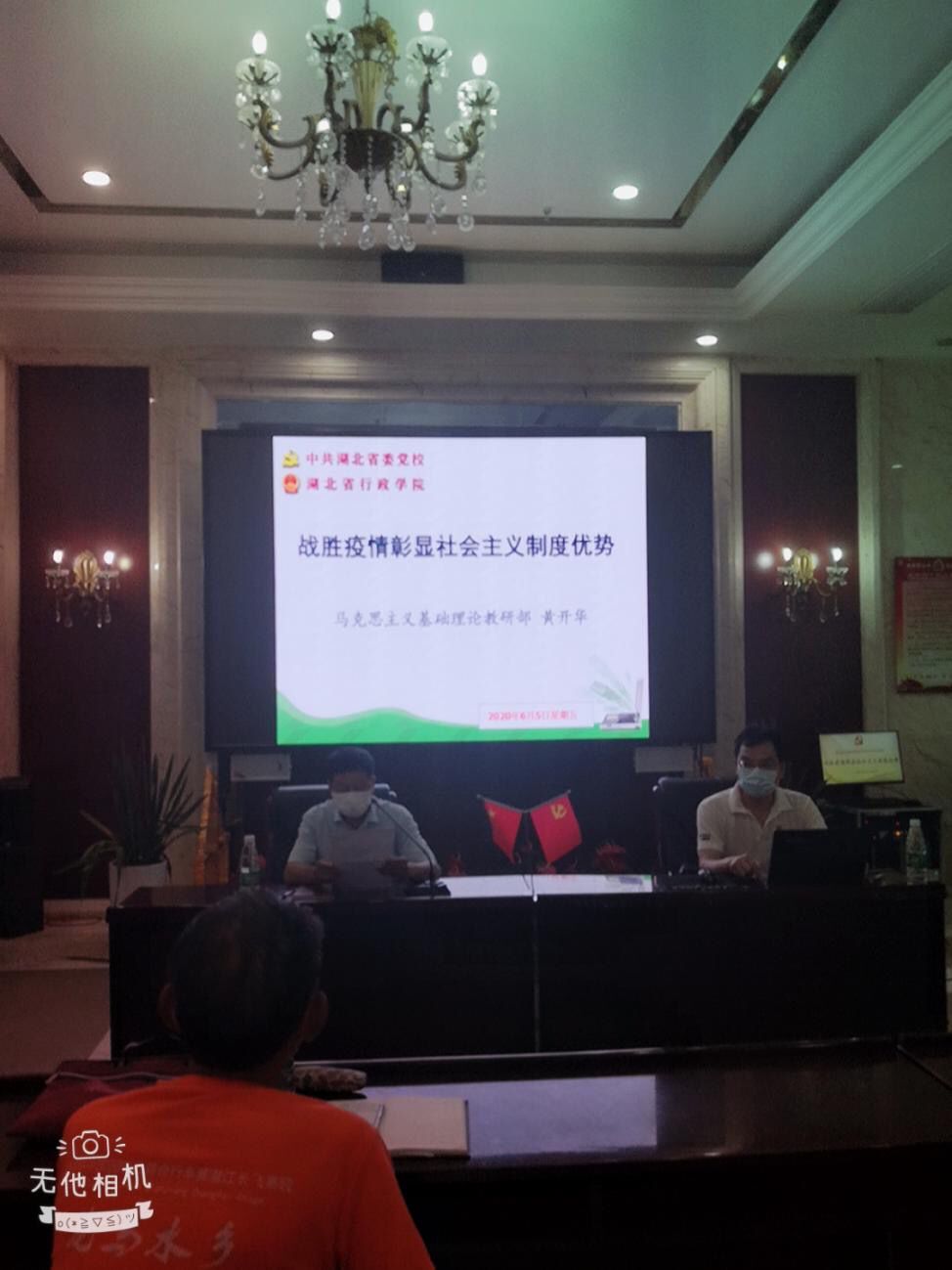 为深入贯彻落实全省党校(行政学院)校(院)长会议精神,按照省委党校年度业务指导工作要点安排,扎实推进党校教师进社区进农村讲党课(简称“两进一讲”)活动,教育引导基层各类组织和居民群众听党话、跟党走,助力社区、农村治理,6月5日,省委党校马克思主义基础理论教研部主任黄开华副教授与校院工作指导处相关同志赴潜江市园林办事处红庙社区金桥郡小区开展“两进一讲”活动。社区党员、居民代表、党校教师共计40多人参加宣讲活动。