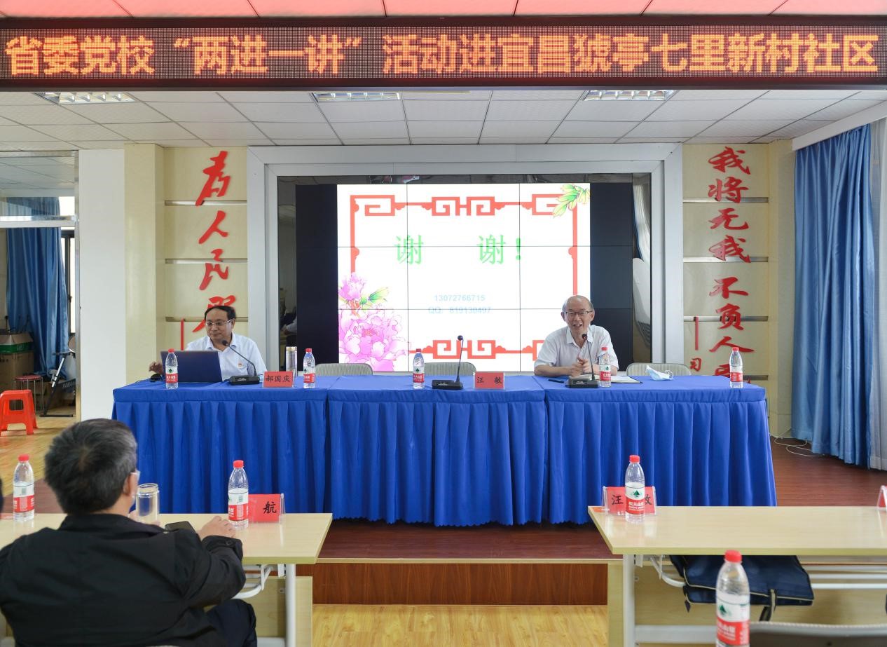 为贯彻落实全省党校(行政学院)校(院)长会议精神,6月19日上午,省委党校教务处、公管教研部与校院工作指导处相关同志赴宜昌市猇亭七里新村社区开展“两进一讲”示范课活动(教师进社区、进农村讲党课)。七里新村社区党员、市委党校常务副校长王大发,副校长汪敏、阮卫红及县(市、区)党校常务副校长、教师代表共80余人参加。