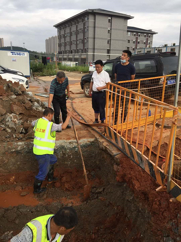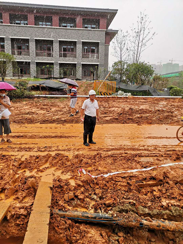 7月27日,冒着瓢泼大雨,常务副校(院)长陶良虎全天蹲点新校区,督促检查新校区建设进度、质量和安全并慰问一线施工人员,快马加鞭推进新校区各个建设项目施工进度。