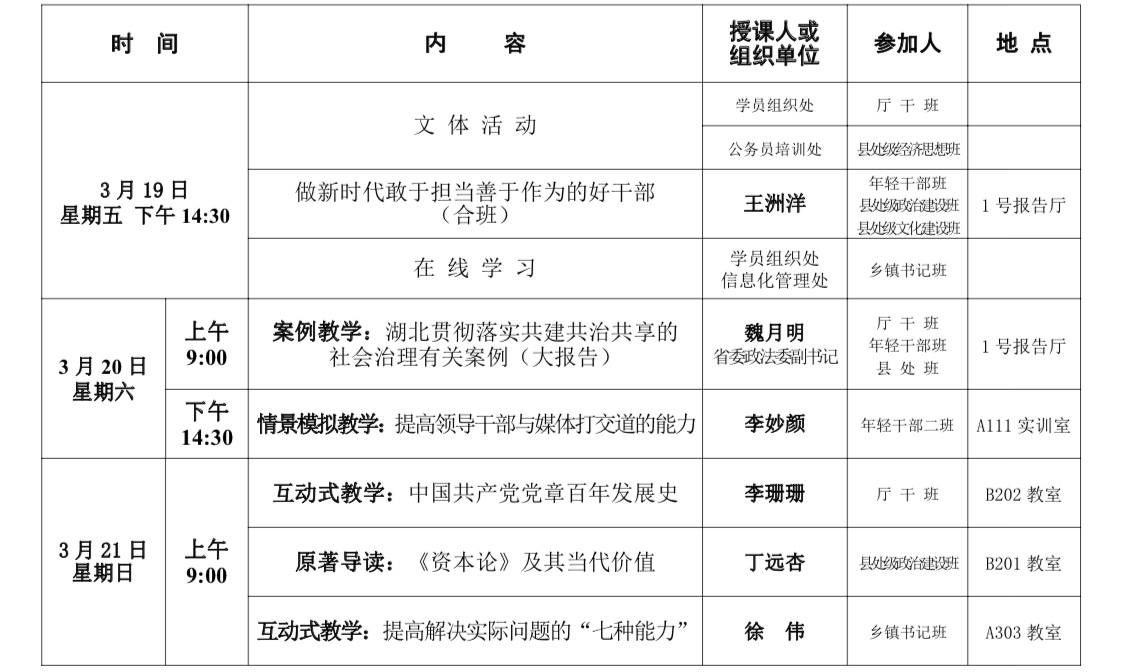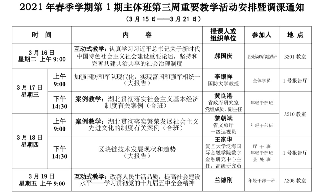 2021年春季学期第1期主体班第三周重要教学活动安排