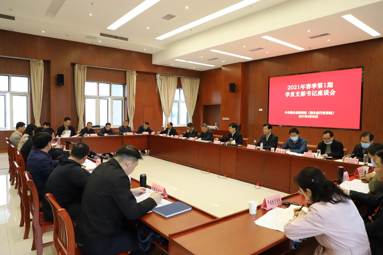3月30日下午,春季第1期学员支部书记座谈会在教学楼召开,7个学员主体班党支部书记,副校(院)长肖卫康,二级巡视员吴维明、管红及有关部馆处室、红安干部学院、珠江物业、中楚物业等部门主要负责人参加会议,会议由肖卫康同志主持。