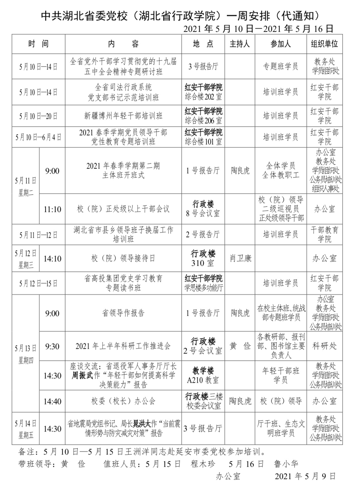 一周安排(2021年5月10日-5月16日)