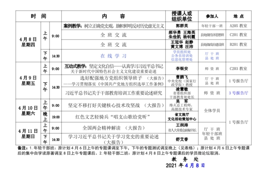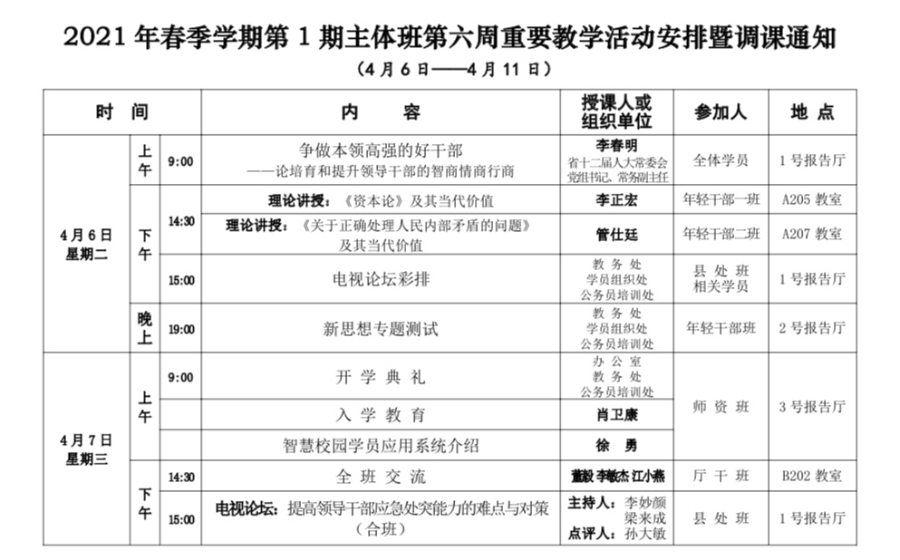 2021年春季学期第1期主体班第六周重要教学活动安排