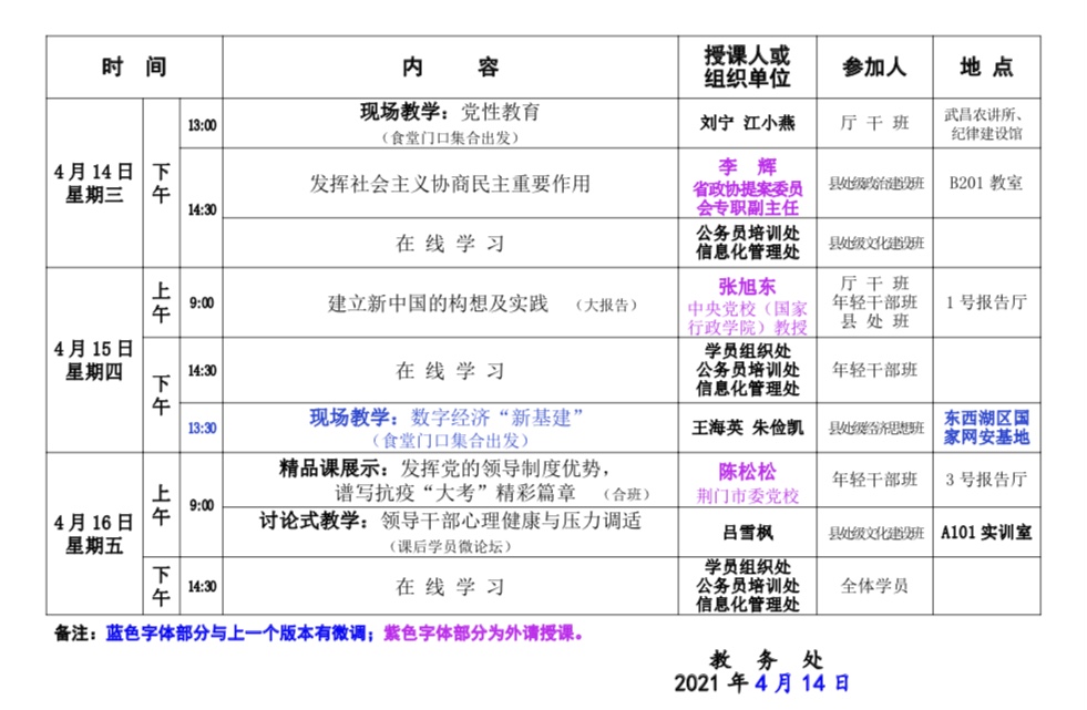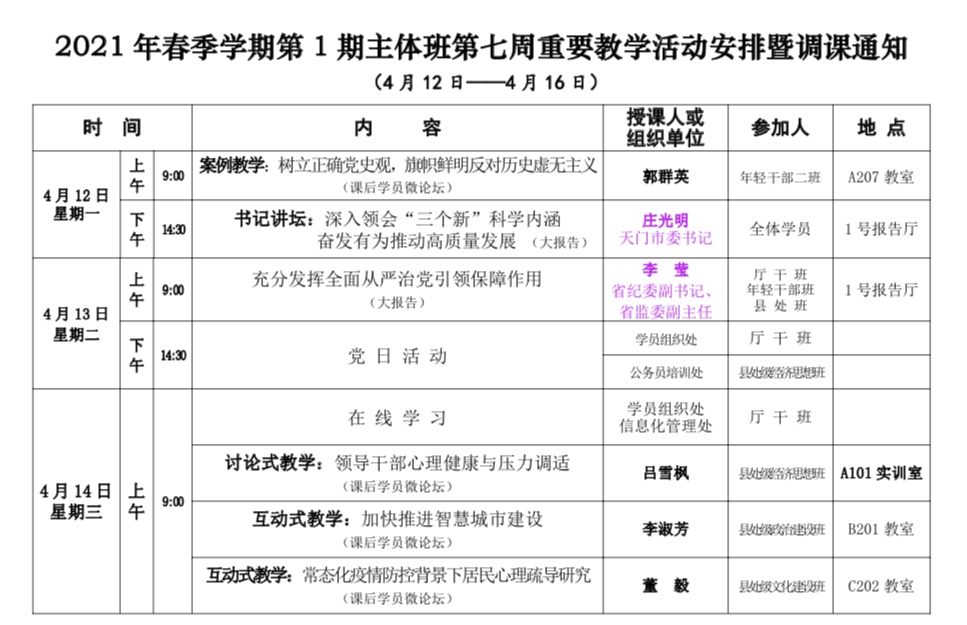 2021年春季学期第1期主体班第七周重要教学活动安排