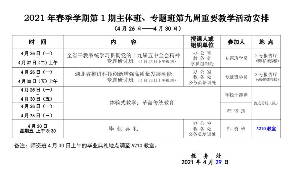 2021年春季学期第1期主体班第九周重要教学活动安排
