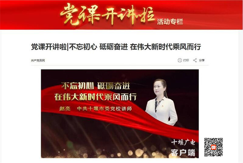 6月21日,由十堰市委党校青年教师赵亮讲授的微党课《不忘初心 砥砺奋进 在伟大新时代乘风而行》在中共中央组织部网站共产党员网“党课开讲啦活动专栏”播出。这是十堰市委党校作品首次在该平台进行展播。