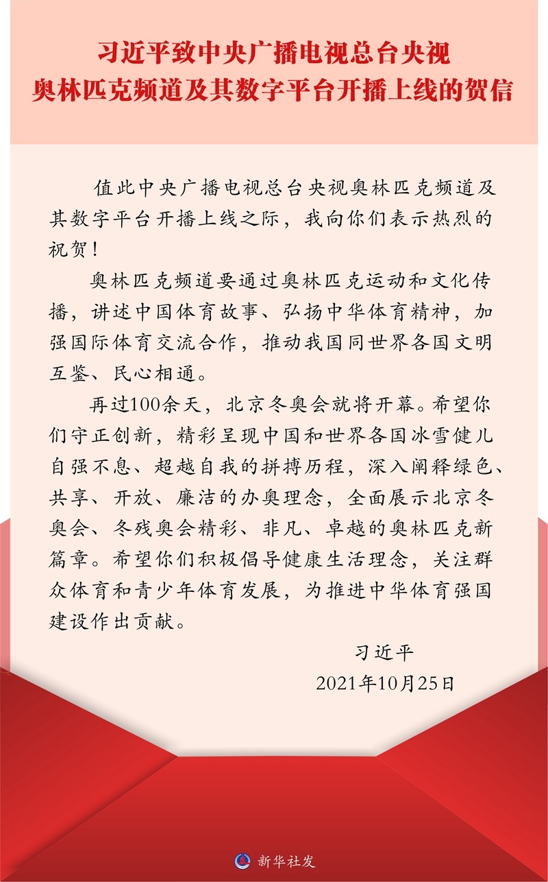 新华社北京10月25日电 在中央广播电视总台央视奥林匹克频道及其数字平台开播上线之际,中共中央总书记、国家主席、中央军委主席习近平发来贺信,表示热烈的祝贺。
