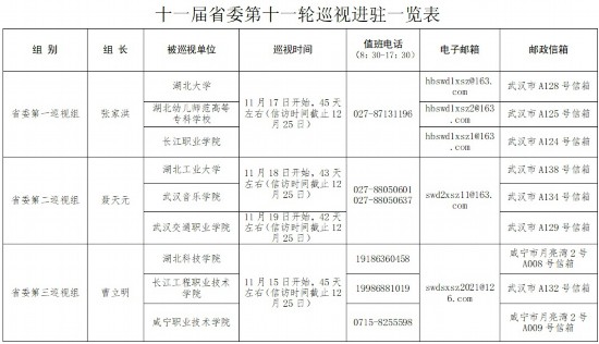 湖北日报讯 截至11月19日,省委11个巡视组完成对33所省属高校党组织的进驻工作,十一届省委第十一轮巡视全面展开。