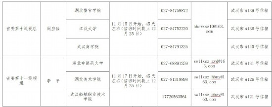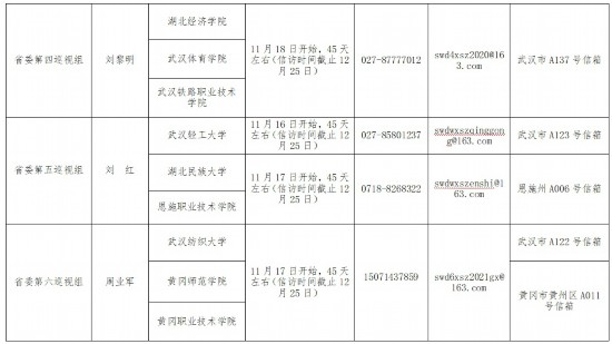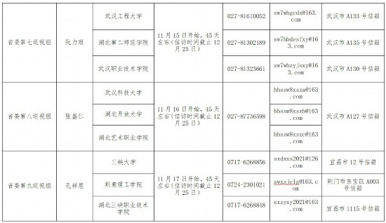 根据省委统一部署,本轮巡视将对湖北大学、武汉科技大学、湖北工业大学、武汉工程大学、武汉纺织大学、湖北中医药大学、武汉轻工大学、武汉体育学院、武汉音乐学院、湖北美术学院、湖北第二师范学院、湖北经济学院、湖北警官学院、三峡大学、湖北民族大学、湖北科技学院、黄冈师范学院、荆楚理工学院、湖北开放大学、湖北幼儿师范高等专科学校、武汉职业技术学院、武汉船舶职业技术学院、武汉交通职业学院、武汉铁路职业技术学院、长江职业学院、长江工程职业技术学院、湖北艺术职业学院、江汉大学、武汉商学院、黄冈职业技术学院、恩施职业技术学院、湖北三峡职业技术学院、咸宁职业技术学院共33所省属高校党组织开展常规巡视,同步开展选人用人、意识形态工作专项检查。
