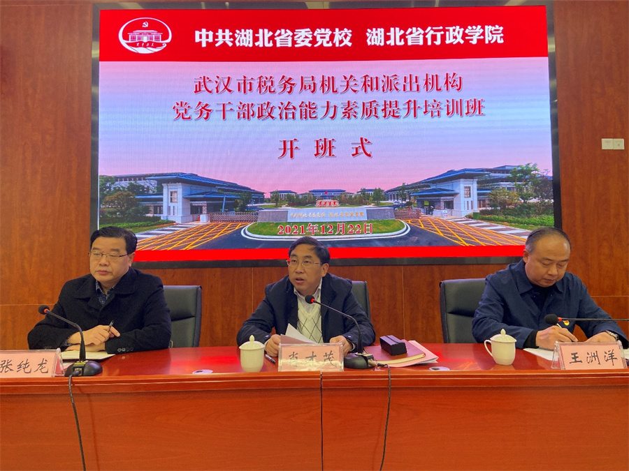 2021年12月21日至24日,武汉市税务局机关和派出机构党务干部政治能力素质提升培训班在中共湖北省委党校(湖北省行政学院)举办。省委党校(省行政学院)副校(院)长王洲洋出席开班式并作入学教育;国家税务总局武汉市税务局党委副书记、副局长肖才茂在开班式上作动员讲话。
