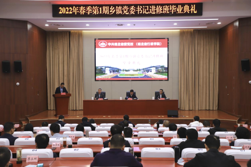 教务处负责同志主持毕业典礼,学员工作处(公务员培训处)负责同志宣读表彰优秀班干部的决定。春季学期第 1 期乡镇党委书记进修班全体学员参加典礼。