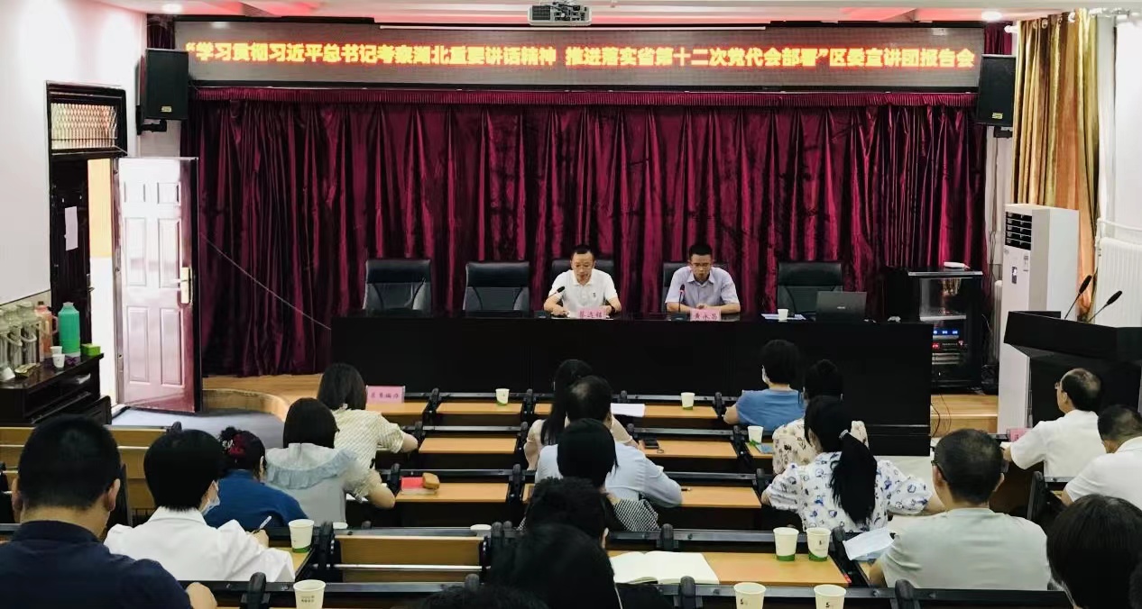 市委宣讲团成员、湖北汽车工业学院马克思主义学院黄永昌副院长以《奋进新征程 建设先行区》为题,从全面领会习近平总书记考察湖北重要讲话的核心要义、湖北省第十二次党代会情况介绍、准确把握党代会报告的主要内容和精神实质、全面学习贯彻落实党代会精神等方面,全面梳理阐释了习近平总书记关于湖北工作的重要要求,深刻解读了省党代会的内涵目标、重点任务和工作要求。区委党校全体教职员工记笔记,认真听,用心感悟,深刻领悟精神实质,为推动理论武装,强化党员干部教育,助推党校事业高质量发展指明了方向,提供了遵循。