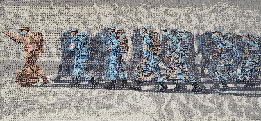 张炼分享了践行艺术为人民宗旨的个人创作实践。他在新冠肺炎疫情湖北保卫战、武汉保卫战后创作的作品《前行》,以国家苦难时刻的爱国救亡革命先贤与新时代迎难而上军人逆行者的形象,构建时空对话与穿越的画面,表层斜线寓意风雨与磨难,由此表达自已对于不同历史时期的前行者无私奉献与家国情怀的敬意与敬仰。