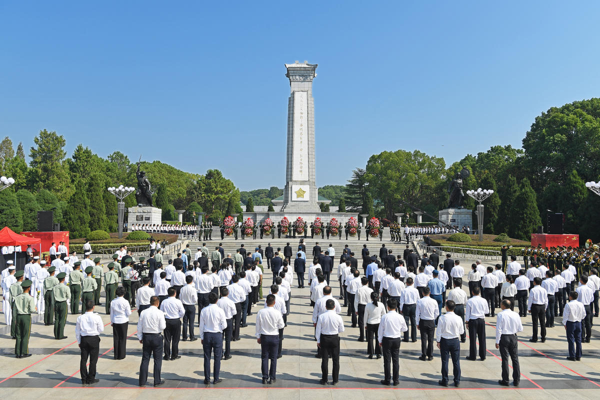 队列前,中共湖北省委,省人大常委会,省人民政府,省政协,省军区,省各民主党派、工商联和无党派爱国人士,省各人民团体、各界群众,老战士、老同志和烈士亲属,省少工委分别敬献的9个花篮整齐排列。花篮缎带上“烈士永垂不朽”6个金色大字熠熠生辉。