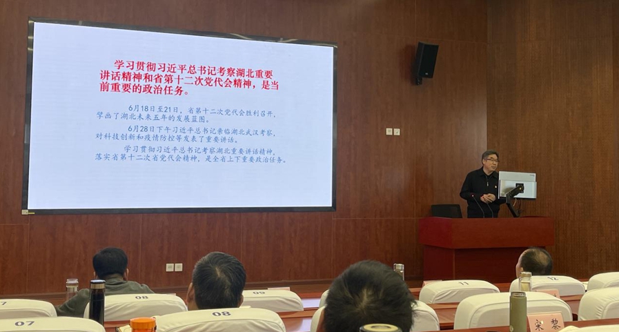 江国志紧扣"学懂、弄通、做实"三个关键词,着重阐释了习近平总书记考察湖北重要讲话精神的深刻内涵、深远意义,深入解读了省第十二次党代会提出"建设全国构建新发展格局先行区"的奋斗目标、重点任务、工作要求,为全班学员结合工作岗位职能职责,胸怀"两个大局",不忘初心、不辱使命,担当善为、善做善成,切实为建设全国构建新发展格局先行区作出应有贡献提出了建设性意见。