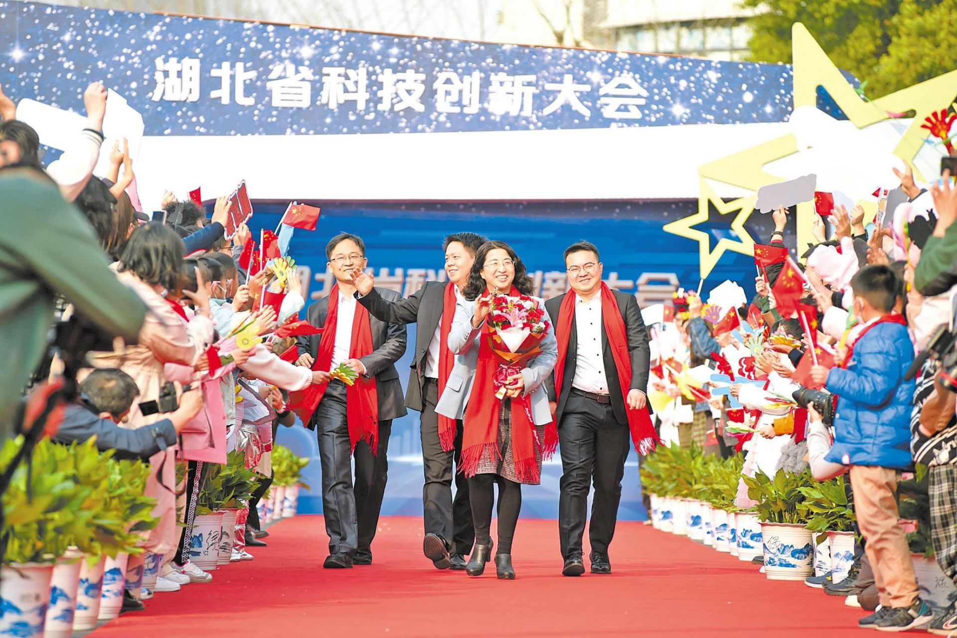 3月16日,湖北省科技创新大会在武汉洪山礼堂举行,14位科学家走上红毯,市民夹道欢迎这群最可爱的人。