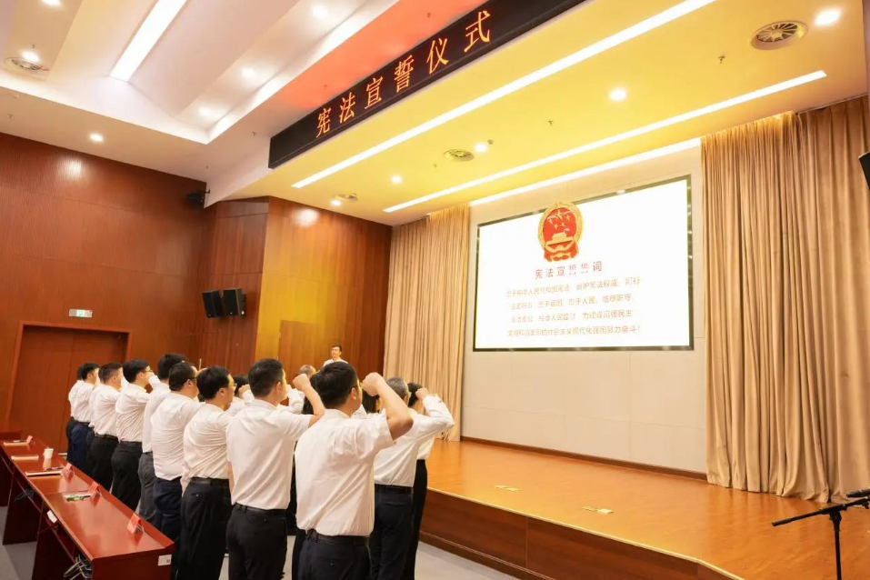 宣誓会场国徽高悬、气氛庄严,全体人员正装肃穆、整齐列队,齐声高唱中华人民共和国国歌,随后,25名宣誓人在监誓人的注视下,在领誓人的带领下,右手握拳高举过肩,集体庄严宣誓。铮铮誓言在会场回响,这是党校人对宪法和人民作出的郑重承诺。