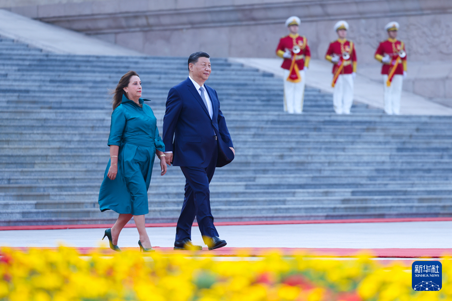 6月28日下午,国家主席习近平在北京人民大会堂同来华进行国事访问的秘鲁总统博鲁阿尔特举行会谈。这是会谈前,习近平在人民大会堂东门外广场为博鲁阿尔特举行欢迎仪式。新华社记者 刘彬 摄