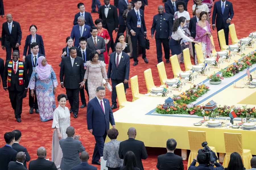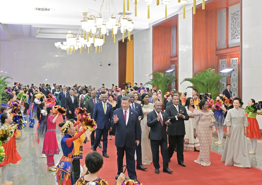 宴会后,习近平和彭丽媛同贵宾们共同观看《携手同行,共筑未来》文艺演出。演出展现了中非多彩文明美美与共、中非人民相知相亲,赢得阵阵热烈掌声。