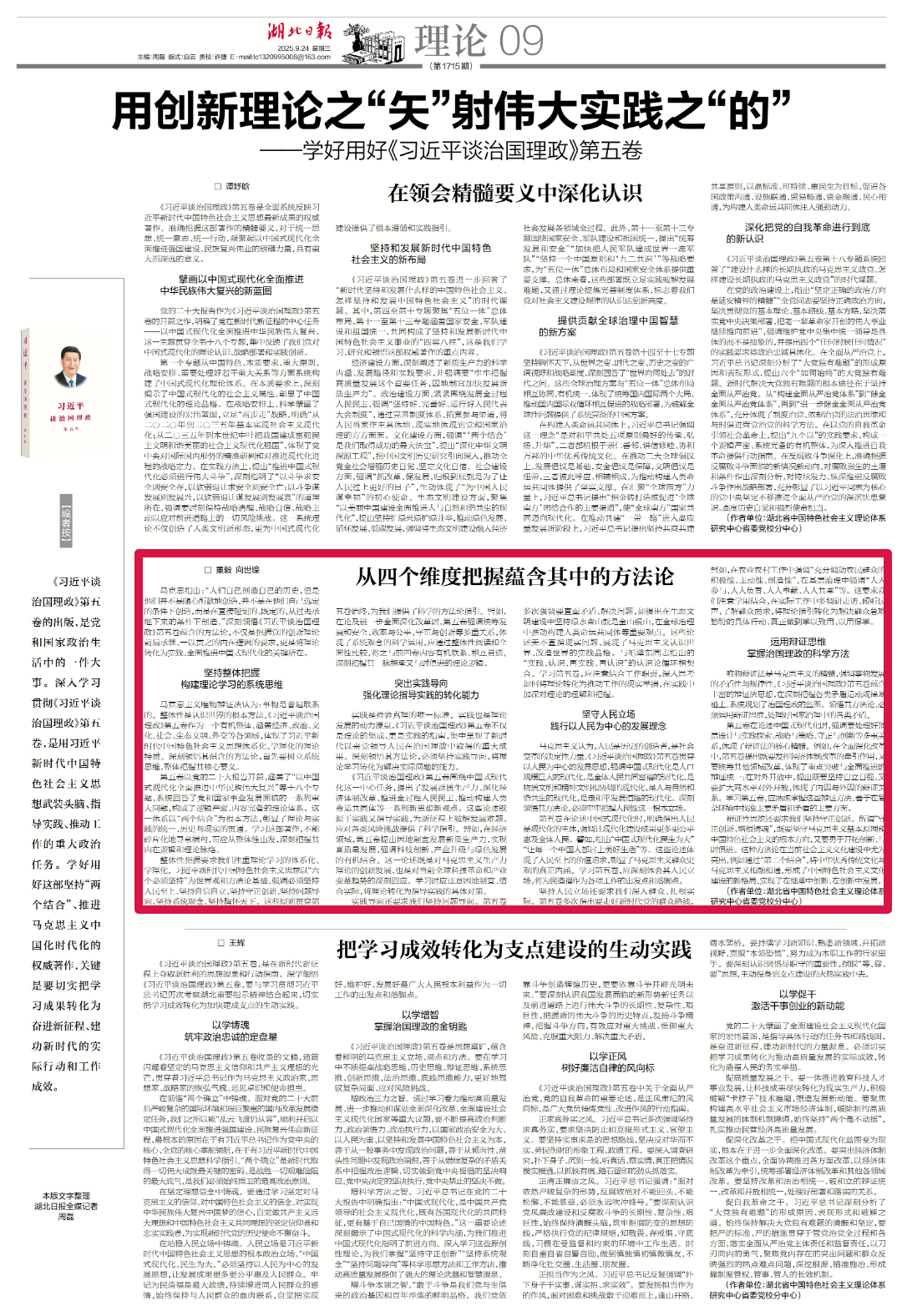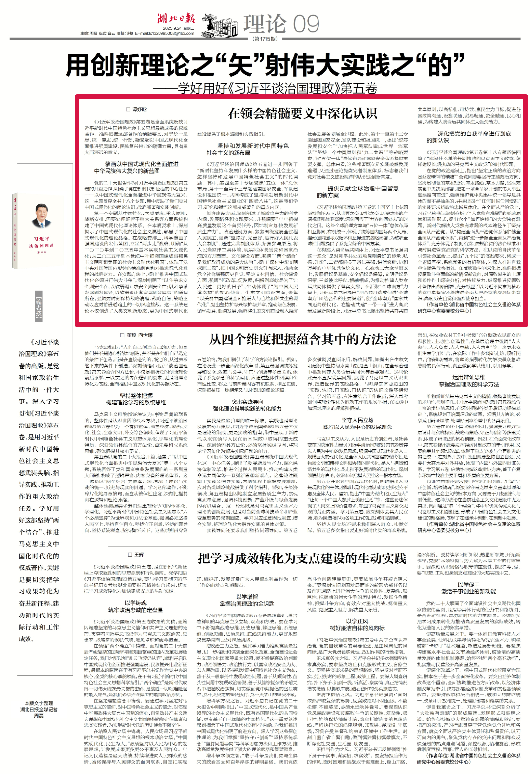 【编者按】《习近平谈治国理政》第五卷的出版,是党和国家政治生活中的一件大事。深入学习贯彻《习近平谈治国理政》第五卷,是用习近平新时代中国特色社会主义思想武装头脑、指导实践、推动工作的重大政治任务。学好用好这部坚持“两个结合”、推进马克思主义中国化时代化的权威著作,关键是要切实把学习成果转化为奋进新征程、建功新时代的实际行动和工作成效。9月24日,《湖北日报》09版理论板块刊发我校教师撰写的系列文章《用创新理论之“矢”射伟大实践之“的”——学好用好〈习近平谈治国理政〉第五卷》,现予以转载。