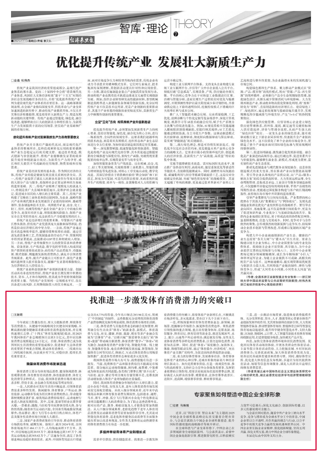 一是,积极探索和培育体育消费新业态、新领域、新场景,挖掘细分市场潜力,拓宽体育消费边界。聚焦消费引领性强的重点领域,重点培育健身休闲、竞赛表演、场馆服务、体育经纪、体育培训等新业态,推进发展冰雪、水上、航空、山地等户外运动项目;满足银发市场、女性及儿童体育消费等多样化的消费需求,注重打造特色消费、培育知名品牌。同时,促进“体育+”深度融合,加强体文、体旅、体创等联动发展,通过“体育搭台、经济唱戏”,突出体育产业关联广的特性,为促进国内消费提供新动能。