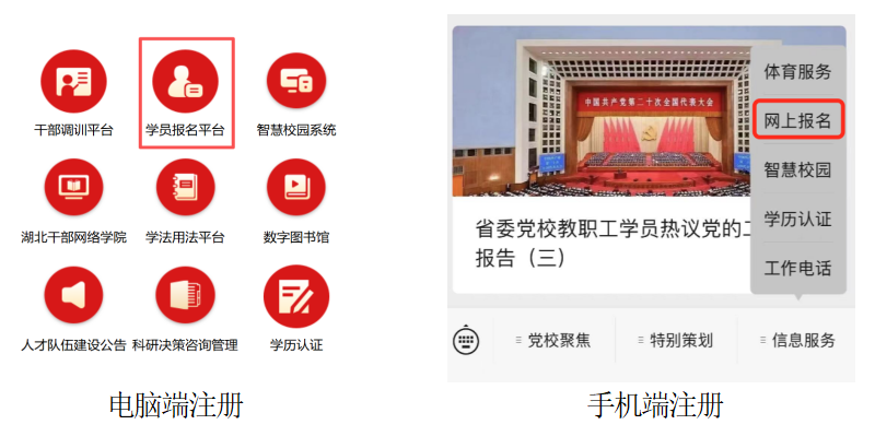 电脑端注册:参训学员通过访问中共湖北省委党校(湖北省行政学院)门户网站www.hbdx.gov.cn,从网站首页右上方“学员报名平台”快捷菜单进入报名页面。